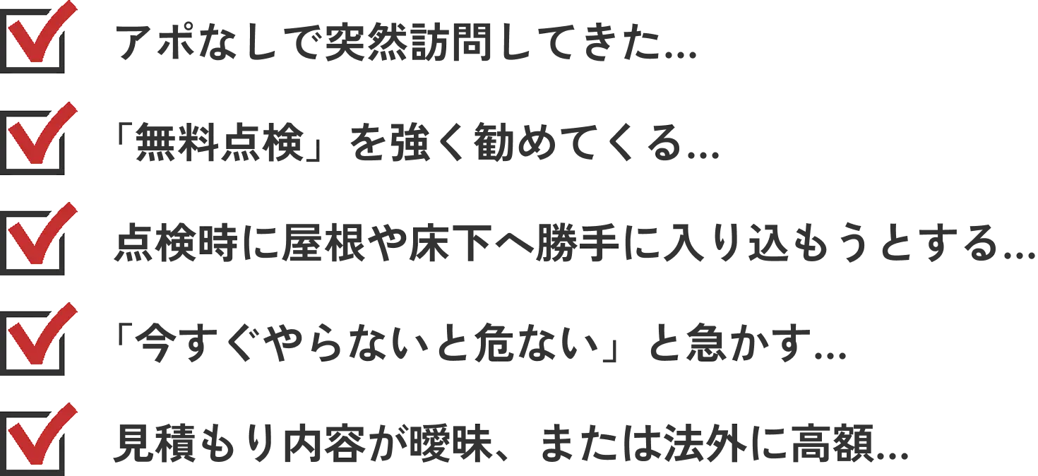 「近所を回って無料点検しています」と名乗る業者が突然訪問し、 “5分だけ見せてください”としつこく頼まれた。 点検後、「家を支える重要な木材が傷んでいて、このままでは家全体が歪む危険が ある」と深刻な表情で説明され、今すぐ工事を進められた。 不安を抱えたまま契約したものの、怖くなり後日別の会社に見てもらうと、 構造材に問題は見当たらず、施された工事も必要性のない内容で あることが判明。